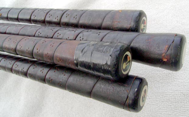 | Matched wood set. Strata Block heads with combo fiber and maple end grain face inserts. Two piece soleplate. Heads in nearly fine condition with all decals intact and minor superficial scuffing. Whipping covers all excellent. Very fine Dynamic stiff steel shafts. 13" leather NON reminder leather wrap grips very good with caps and collars in place. Driver has black tape around butt end just below cap and black tape at collar end in place of collar. |