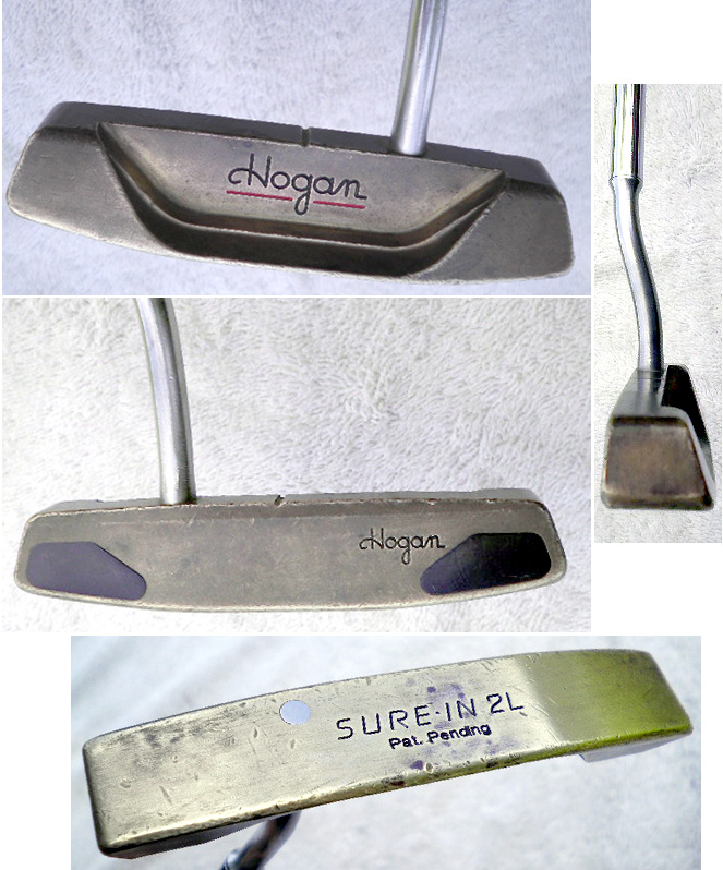 Great design seen many times over, even to the present. The Sure-Out and Sure-On wedges appeared around 1965 so this 'sure-in' likely was introduced around the same time. Other than edgewear, face-balanced head is in very good condition - note beveled top edge on face. Not sure what is under the black plastic heel-toe face inserts. Twisted neck, to offset the head, rises 90 degrees from top of head. Neck is aluminum with thrubore to sole. Nearly new overhosel stepped steel shaft with very fine chrome sparkle and excellent IMD weighting shaftband. Lamkin Perma Tac rubber pistol grip is fine and soft. 35".